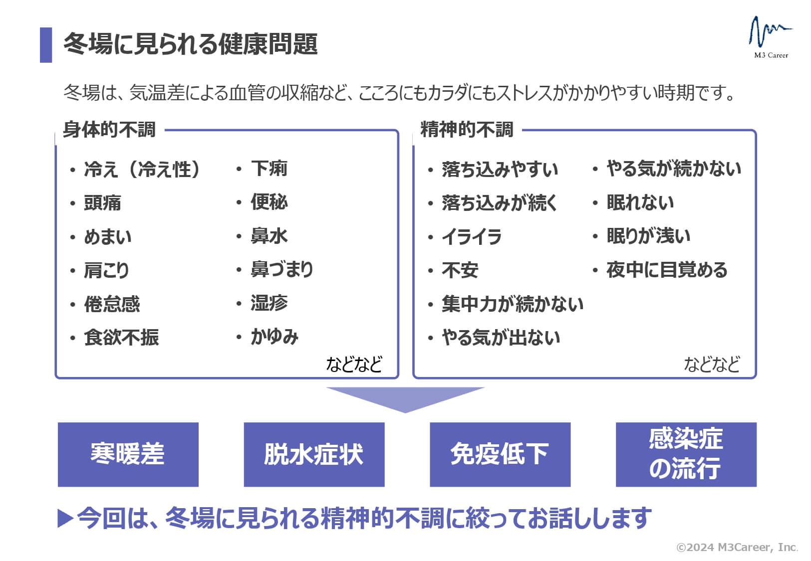 季節性感情障害について、有効な情報をスライドにまとめました。衛生委員会における講話等で使える資料です。
